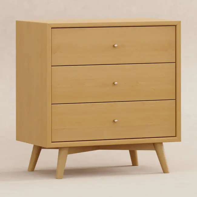 The Palma 3-Drawer Dresser is a sophisticated mid-century inspired design with tapered legs, brushed metal hardware, and smooth-glide drawers. It's a versatile modern piece, providing ample storage space that can double as a changing station. Pair with the Palma 4-in-1 Crib or Peggy 3-in-1 Crib for an elegant nursery.