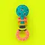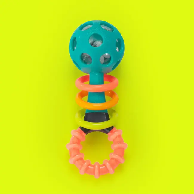This soft, squishy rattle is perfect for baby. The bright colors, different materials, and variety of surfaces help stimulate baby. In the sphere of the rattle are contrasting black & white beads that stimulate baby’s developing vision and awaken auditory awareness. Additionally, the brightly colored click-clack rings provide auditory stimulation, while the textured handle is great for mouthing.
