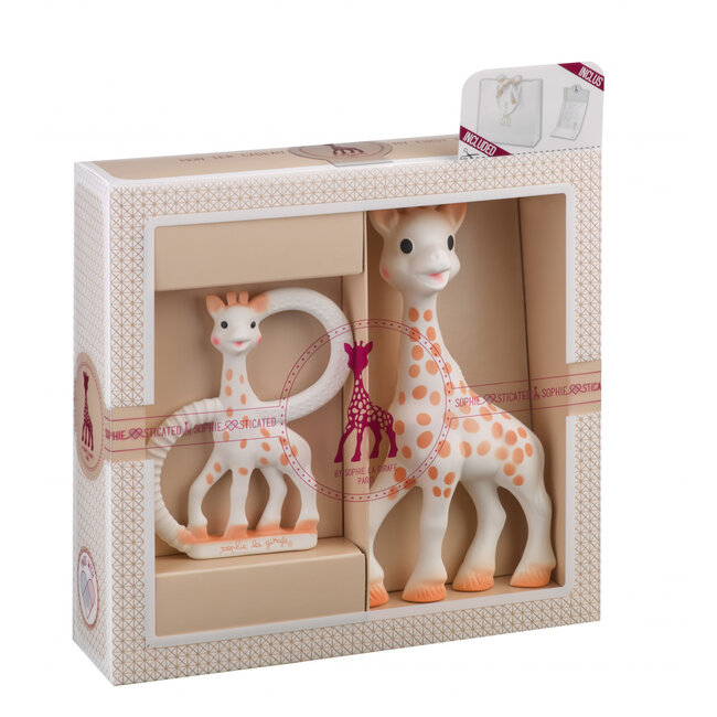 Sophie la girafe. A lovely with soother holder the perfect gift for baby shower!. The “sophiesticated” sets include: the set + a bag + a gift card.